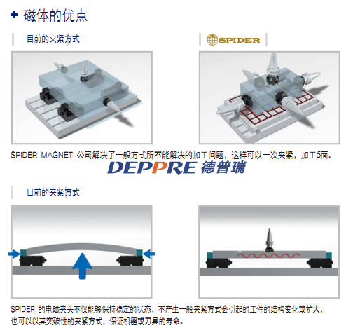 SPIDER MAGNET公司專注于機(jī)床的切割工藝的優(yōu)化,道具的快速負(fù)載和卸載,注塑機(jī)和沖壓機(jī)的模具。因?yàn)橐话愕墓ぷ鲓A緊方式不能滿足客戶的需求,為了緊跟行業(yè)發(fā)展的速度,需要有一種新的工作夾緊技術(shù),所以,我們公司開發(fā)了一種可靠和優(yōu)異的永久電磁夾頭。當(dāng)前,大部分好公司使用優(yōu)質(zhì)的機(jī)床和性能優(yōu)異的CAD/CAM系統(tǒng)來提高生產(chǎn)力。然而,由于普通的工作夾緊方式能力有限,與機(jī)床和CAD/CAM系統(tǒng)的價值不匹配,與不能100%發(fā)揮其能力。